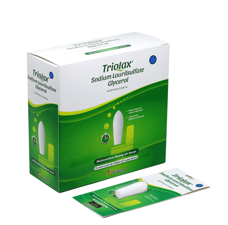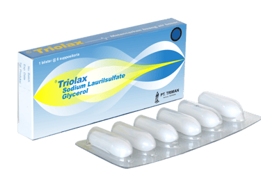 Triolax adalah obat laxative supositoria yang bekerja merangsang selaput lendir usus besar sehingga terjadi dorongan gerakan peristaltik dan menyebabkan buang air besar.